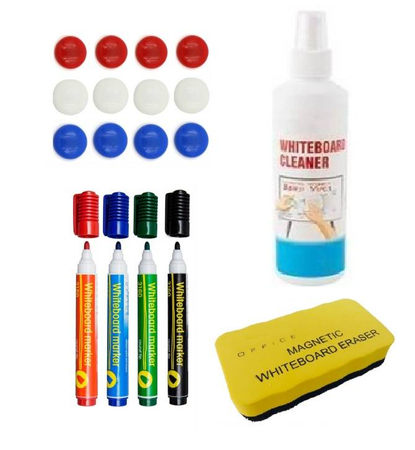 - Markery 4 szt, płyn 50 ml, wycierak magnetyczny, magnesy 10 szt.
